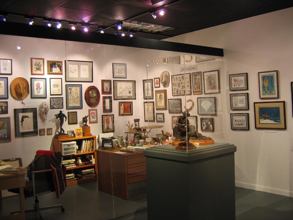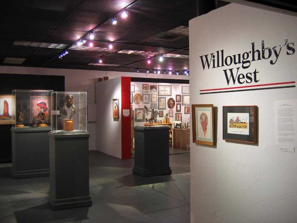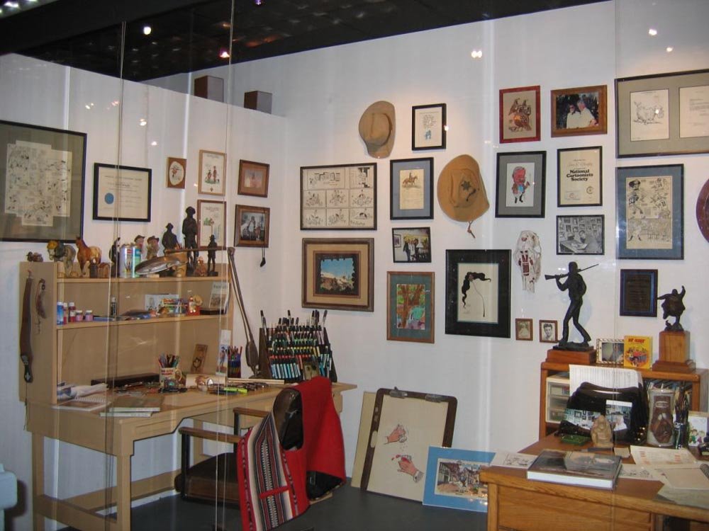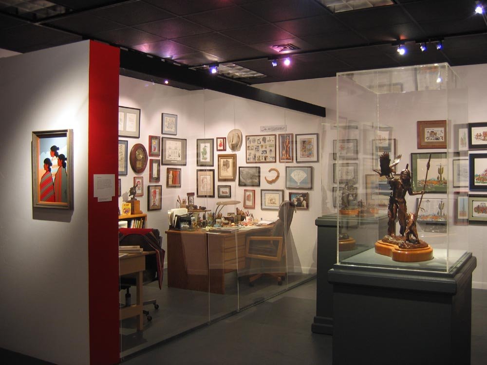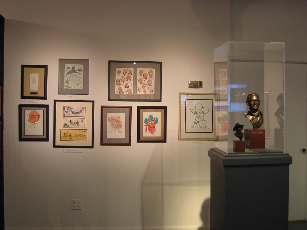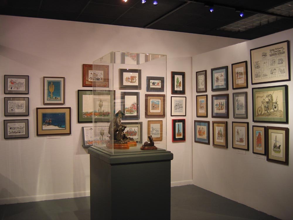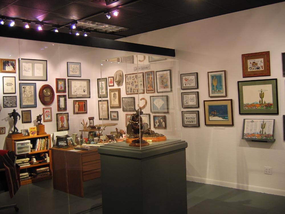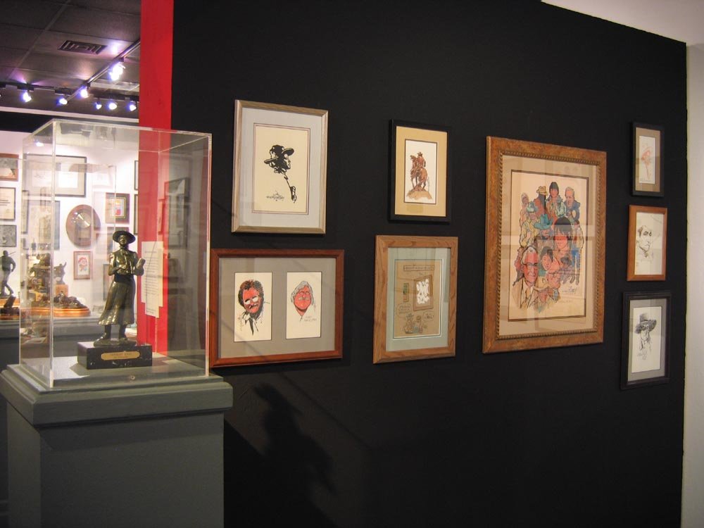 Bronze entitled "My Dad" and Arizona Cowman in foreground. Caricatures of famous Arizona people in background